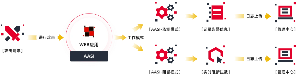 | 实时发现与阻断 | 由于AASI是注入到应用程序中,当应用程序遭受到实际攻击和伤害时,AASI可以实时检测和阻断安全攻击,无需人工干预。 |