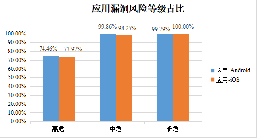 针对移动互联网应用分发渠道近一年有更新且下载量较高的移动互联网应用抽样进行漏洞扫描。总计检测Android应用11万款, iOS应用0.3万款。检查结果显示:Android应用中存在高危漏洞应用数占已检测Android应用总数的74.46%,iOS应用存在高危漏洞应用数占已检测iOS应用总数的73.97%,如图2-1所示。随着各分发渠道对上架应用安全检测力度的加强,相比去年,Android应用高危漏洞占比呈小幅度下降趋势,下降比例为9.15%。