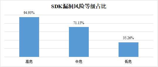 同时,对近一年更新、发布的SDK抽样进行漏洞扫描。共检测SDK 0.7万款,其中存在高危漏洞的SDK占总数的94.93%,如图2-2所示。SDK广泛应用于移动互联网应用的设计开发阶段,其漏洞风险不容忽视。