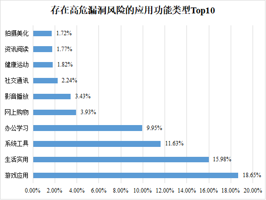 图2-4 各功能类型应用中存在高危漏洞的占比Top10