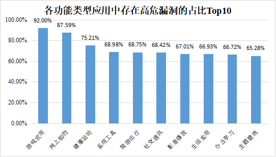 从存在高危漏洞的各功能类型应用在同类型已检测的应用中的占比情况来看,游戏类、网上购物、健康运动类中,存在高危漏洞的应用占比分别为92.00%、87.59%、75.21%,均在75%以上,如图2-4所示。