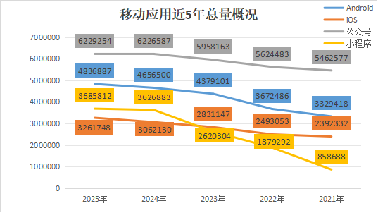 截至2025年5月,在安卓系统(Android)移动互联网应用分发渠道上监测到的App数量累计有483万款,较去年同期增长2.43%,其中活跃App[ 活跃App是指在统计时间的3个月内有更新的App]数量占比达到1.63%左右;在苹果系统(iOS)分发渠道上监测到的App数量累计326万款,较去年同期增长6.52%。不断升级的用户需求驱动开发者推出更多不同细分领域的App,近两年行业增速呈现放缓趋势,标志着移动应用市场正逐步进入饱和期。