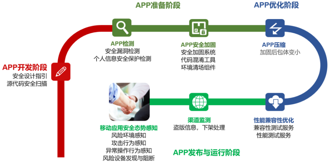 在开发测试阶段,提供Android应用安全加固、iOS移动应用安全加固、鸿蒙原生应用防护、小程序安全加固、快应用安全加固等服务,抵御逆向破解、恶意篡改等攻击,从源头降低安全风险;