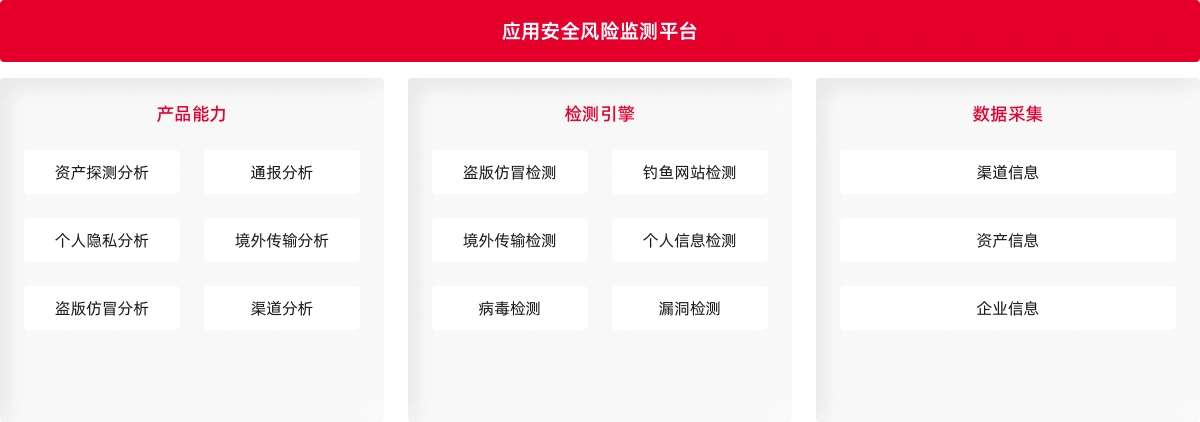 渠道监测 能够针对企业市场上存在的正版应用、盗版应用、近似应用、名称异常、疑似钓鱼网站进行监测。